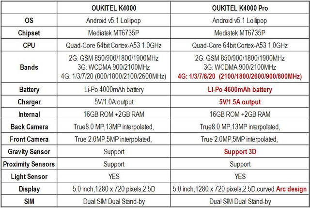 3). OUKITEL K4000 і OUKITEL K4000 Pro мають стандарти передачі даних 2G і 3G, в той час як у смугах частот 4G, K4000 є група 1/3/7/20, K4000 Pro це група 1/3/7/8/20 для більш широкого використання.